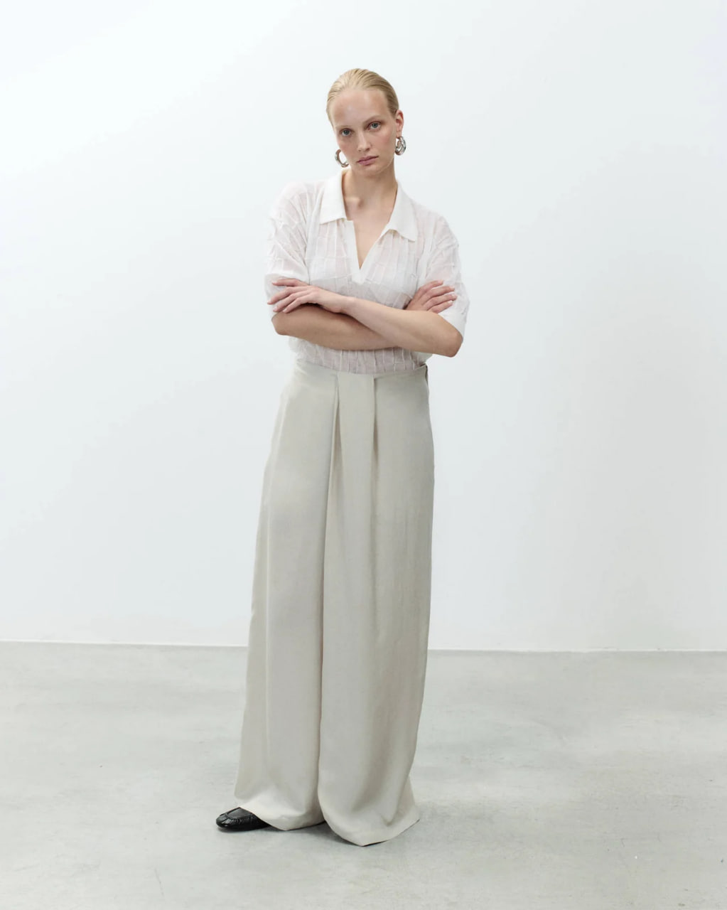 - Брюки из 100% шелка - Свободный крой - Потайная боковая молния - Драпировка спереди - Эластичный пояс сзади - Боковые карманы