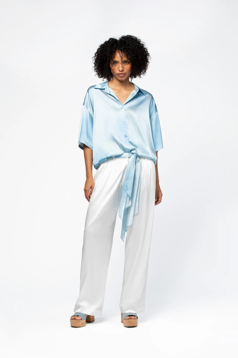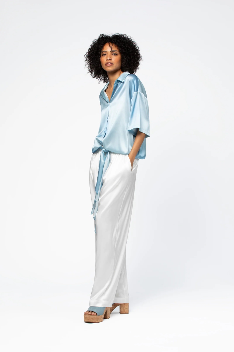 - Широкие шелковые брюки - Свободный крой - Пояс с петлями для ремня - Шелковый пояс-завязка - Задние карманы с кантом - Легкая, воздушная драпировка - Элегантный, женственный силуэт