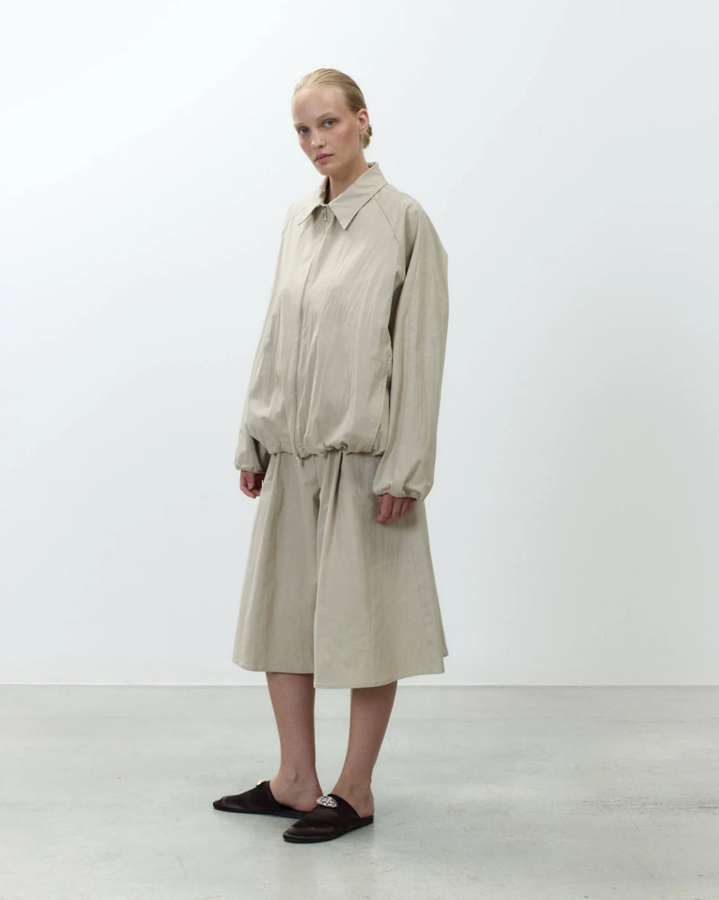 - Свободный крой - Классический воротник - Застежка на металлическую молнию спереди - Длинные рукава с эластичными манжетами - Регулируемый низ на шнурке - Боковые карманы