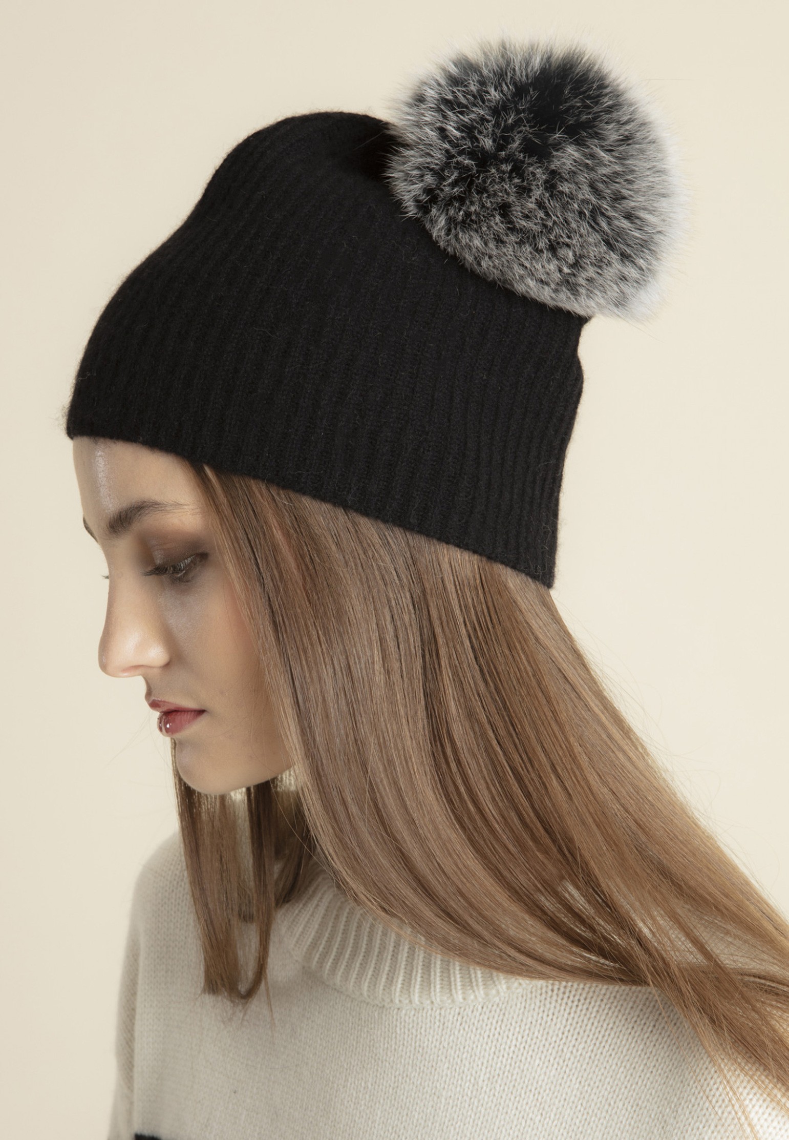Шапка MAX&MOI ребристая с помпоном из лисы, черная TU